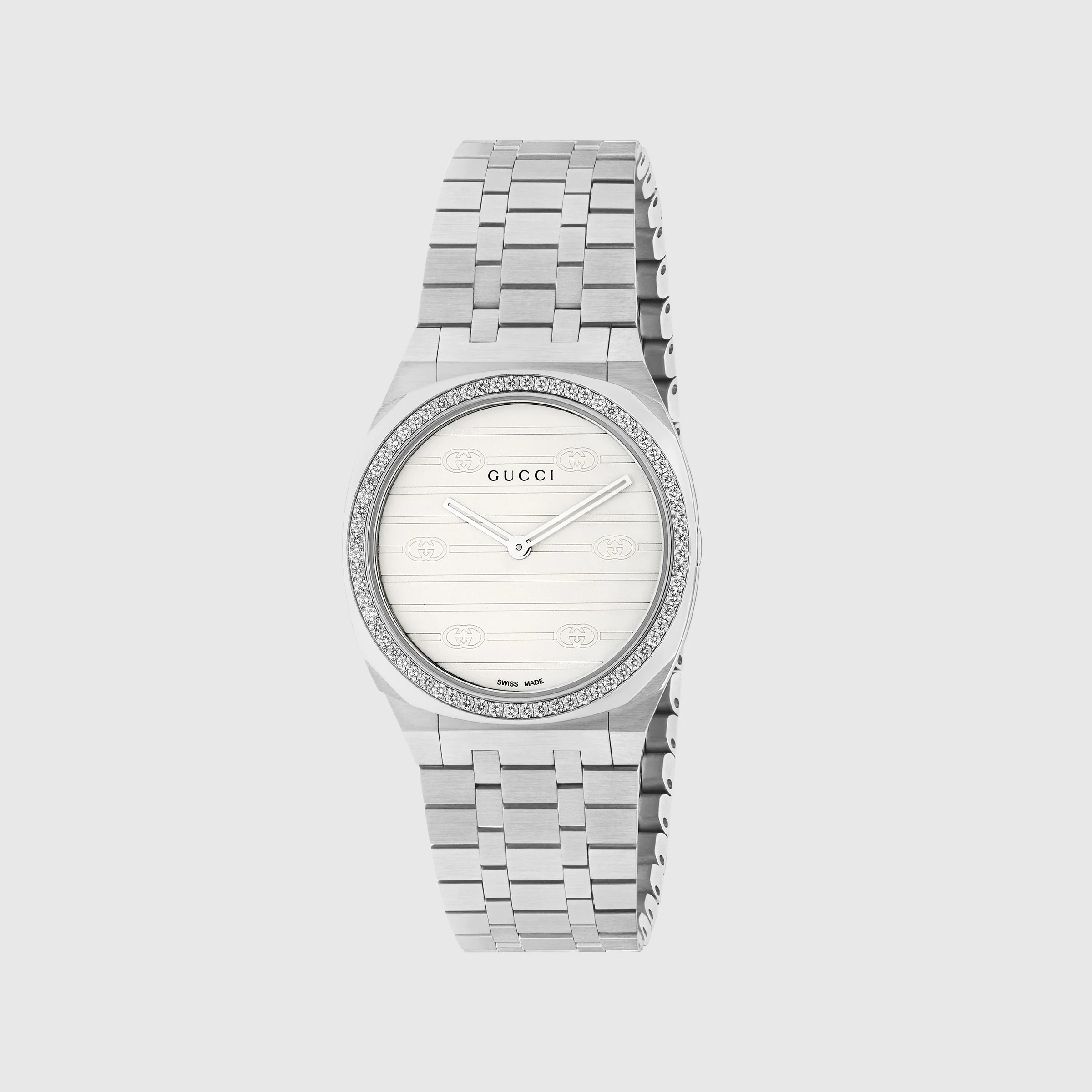 The GUCCI 25H's streamlined silhouette was inspired by the sleek forms of contemporary architecture. The watch is presented with a thin multi-layer case and five-link steel bracelet, while the design is completed by diamonds and Interlocking G motif. The name, GUCCI 25H, is attributed to a particularly symbolic talisman for Creative Director Alessandro Michele. - 30mm stainless steel multi layered case, bezel set with diamonds, white brass dial with Interlocking G motif, five links stainless steel bracelet - Sapphire glass with antireflective coating - The warranty certificates for Gucci watches purchased after March 1st 2022 are exclusively available online. - Download your certificate at - by using the serial number engraved on the back of your watch. - 3 ATM (30 meters/98 feet) - Quartz movement - Wrist size from 4.3" to 6.9" - YA163503 - Swiss Made