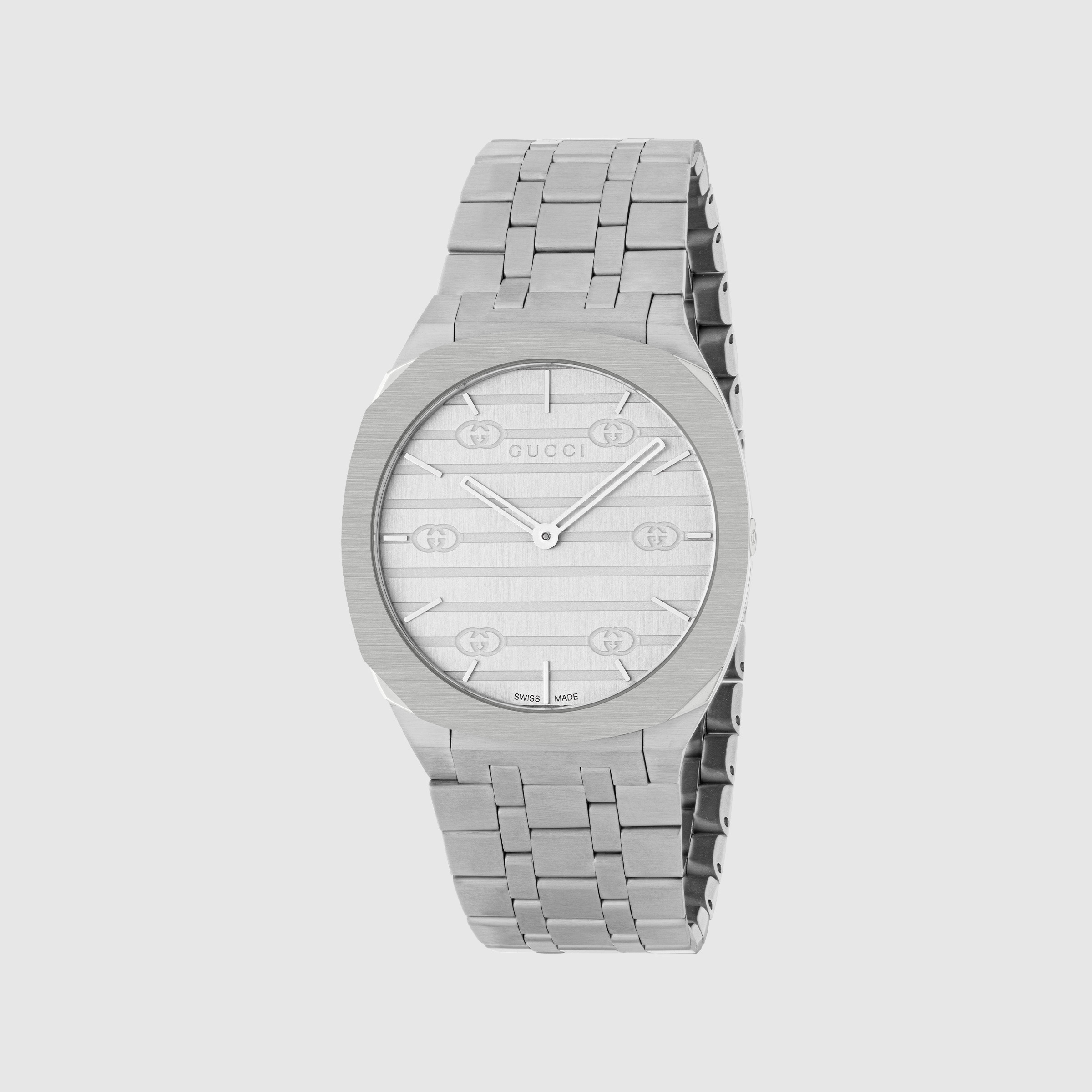 The GUCCI 25H's streamlined silhouette was inspired by the sleek forms of contemporary architecture. The watch is presented with a thin multi-layer case and five-link steel bracelet, while the design is completed by a silver brass dial and Interlocking G motif. The name, GUCCI 25H, is attributed to a particularly symbolic talisman. - 34mm stainless steel multi-layered case, silver brass dial with Interlocking G motif, five link stainless steel bracelet - The warranty certificates for Gucci watches purchased after March 1st 2022 are exclusively available online. - Download your certificate at - by using the serial number engraved on the back of your watch. - 3 ATM (30 meters/98 feet) - Sapphire glass with antireflective coating - Quartz movement - Wrist size from 4.3" to 6.9" - YA163402 - Swiss Made