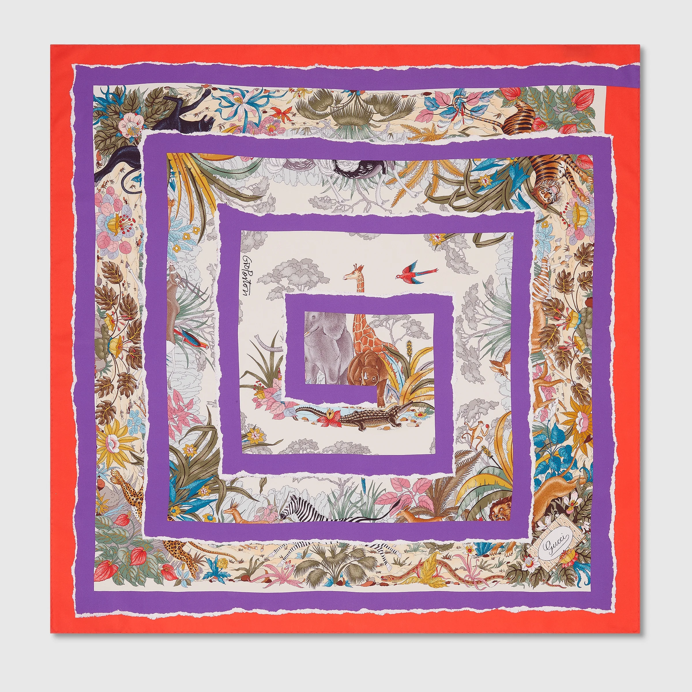 Featuring artwork by illustrator Gio Pastori, renowned for his paper technique which creates visually striking compositions, this carre explores Gucci's motif around nature as part of the 90 x 90 project. - Multicolor silk twill - Plants and animals print - Artwork by Gio Pastori - 35.4"W x 35.4"L - Made in Italy - The dimensions of this item may vary slightly as the hem is hand-sewn