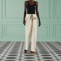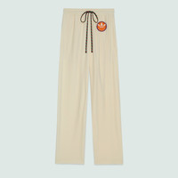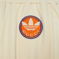 A second chapter in the adidas and Gucci collection, where the Web continues to juxtapose with the three white stripes and the GG monogram combines with the Trefoil. Pulling inspiration from the Creative Director’s memories of the '80s and '90s, emblematic House’s motifs mix with those of the historic sportswear brand adidas resulting in a series of hybrid looks. This pair of pants in light beige chenille cotton features a Gucci Trefoil embroidered patch. - Light beige chenille cotton - Gucci Trefoil embroidered patch - adidas x Gucci - Elastic waistband - Drawstring closure - Length: 42.1" based on a size small - Leg opening: 8.5" based on a size small - The product shown in this image is a size small