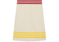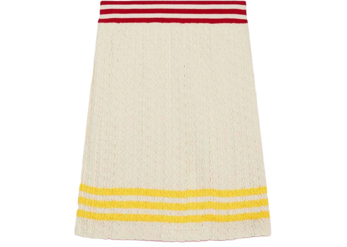 Part of the adidas x Gucci collection, this cotton skirt features multiple stripes. Emblematic House’s motifs mix with those of the historic sportswear brand adidas. The collection sees both heritages encoded in a trio of lines, where adidas and Gucci combine archival emblems. Creative Director, Alessandro Michele pulls inspiration from his memories of the ‘80s and ‘90s for a collection that is both nostalgia-driven and contemporary. - Ivory cotton needle punch rhombus motif - adidas x Gucci - White and red rib detail - Yellow stripes at the hem - Lined - Elastic waistband - Pleated - Length: 15", based on a size small - Made in Italy - The product shown in this image is a size small