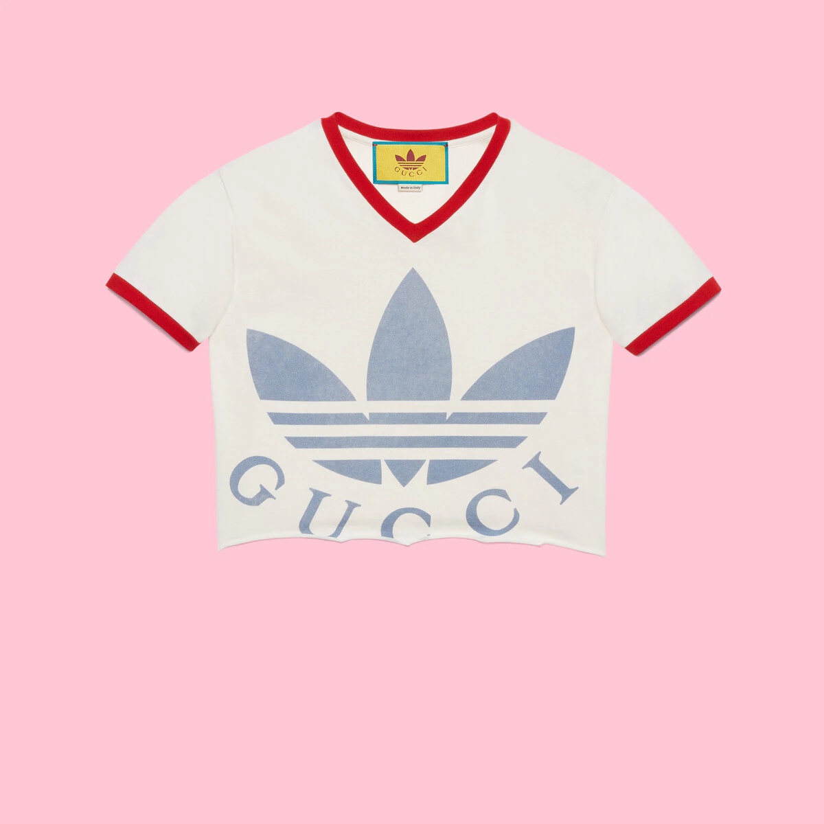 Part of the adidas x Gucci collection, this cropped T-shirt features the Gucci Trefoil print. Emblematic House’s motifs mix with those of the historic sportswear brand adidas. The collection sees both heritages encoded in a trio of lines, where adidas and Gucci combine archival emblems. Creative Director, Alessandro Michele pulls inspiration from his memories of the ‘80s and ‘90s for a collection that is both nostalgia-driven and contemporary. - White cotton jersey - Red trims - Gucci Trefoil print - adidas x Gucci - V-neck - Short sleeves - Length: 15.7", based on a size extra small - Made in Italy - The product shown in this image is a size extra small