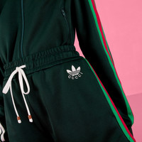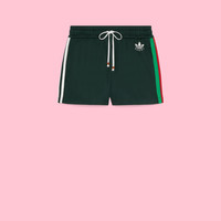 Part of the adidas x Gucci collection, this pair of shorts features Gucci Trefoil embroidery. Emblematic House’s motifs mix with those of the historic sportswear brand adidas. The collection sees both heritages encoded in a trio of lines, where adidas and Gucci combine archival emblems. Creative Director, Alessandro Michele pulls inspiration from his memories of the ‘80s and ‘90s for a collection that is both nostalgia-driven and contemporary. - Dark green cotton jersey - Gucci Trefoil embroidery - adidas x Gucci - 3-stripes and Gucci Web appliqué - Elastic waistband with drawstring - Length: 13.7", based on a size small - Leg opening: 27.5" - Made in Italy - The product shown in this image is a size small