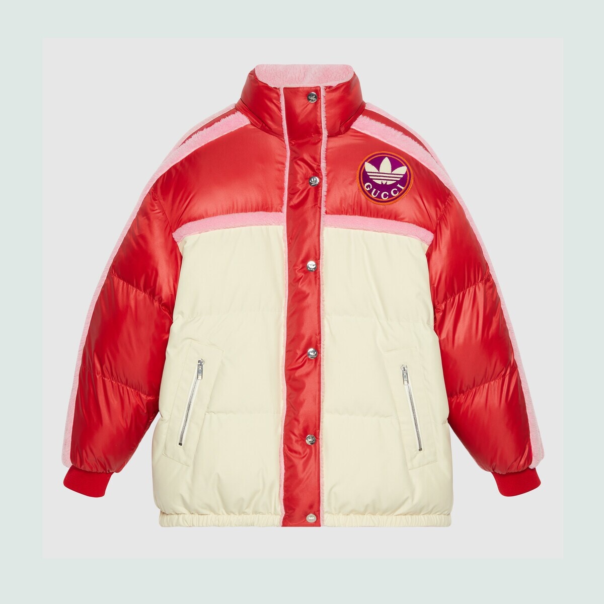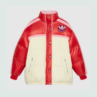 A second chapter in the adidas and Gucci collection, where the Web continues to juxtapose with the three white stripes and the GG monogram combines with the Trefoil. Pulling inspiration from the Creative Director’s memories of the '80s and '90s, emblematic House’s motifs mix with those of the historic sportswear brand adidas resulting in a series of hybrid looks. This padded nylon bomber jacket reverses to a padded fleece and both sides feature the Gucci Trefoil embroidered patch. - Pink and red fleece on one side and ivory, red and pink padded nylon on the other side - Gucci Trefoil embroidered patch - adidas x Gucci - Snap button and zip closure - Front zip pockets - Length: 29"
