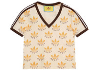 Part of the adidas x Gucci collection, this T-shirt features the all-over Gucci Trefoil print. Emblematic House’s motifs mix with those of the historic sportswear brand adidas. The collection sees both heritages encoded in a trio of lines, where adidas and Gucci combine archival emblems. Creative Director, Alessandro Michele pulls inspiration from his memories of the ‘80s and ‘90s for a collection that is both nostalgia-driven and contemporary. - Ivory cotton jersey with Gucci Trefoil print - Black trims - 3-stripes appliqué - adidas x Gucci - V-neck - Short sleeves - Length: 19.8", based on a size extra small - Made in Italy - The product shown in this image is a size extra small