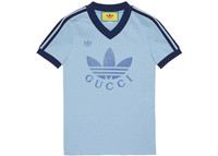 Part of the adidas x Gucci collection, this V-neck T-shirt features the Gucci Trefoil print. Emblematic House’s motifs mix with those of the historic sportswear brand adidas. The collection sees both heritages encoded in a trio of lines, where adidas and Gucci combine archival emblems. Creative Director, Alessandro Michele pulls inspiration from his memories of the ‘80s and ‘90s for a collection that is both nostalgia-driven and contemporary. - Light blue cotton jersey - Dark blue trims - Gucci Trefoil print - adidas x Gucci - V-neck - Short sleeves - Length: 25.5", based on a size extra small - Made in Italy - The product shown in this image is a size extra small