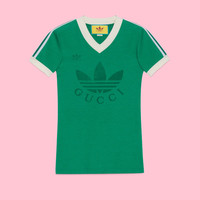 Part of the adidas x Gucci collection, this V-neck T-shirt features the Gucci Trefoil print. Emblematic House’s motifs mix with those of the historic sportswear brand adidas. The collection sees both heritages encoded in a trio of lines, where adidas and Gucci combine archival emblems. Creative Director, Alessandro Michele pulls inspiration from his memories of the ‘80s and ‘90s for a collection that is both nostalgia-driven and contemporary. - Green cotton jersey - Ivory trims - Gucci Trefoil print - adidas x Gucci - V-neck - Short sleeves - Length: 25.5", based on a size extra small - Made in Italy - The product shown in this image is a size extra small