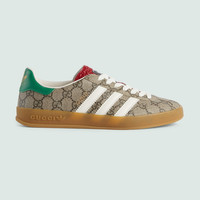 A second chapter in the adidas and Gucci collection, where the Web continues to juxtapose with the three white stripes and the GG monogram combines with the Trefoil. Inspired by the '80s and '90s, emblematic House’s motifs mix with those of the historic sportswear brand adidas resulting in a series of hybrid looks. The signature Gazelle sneaker appears in the beige and ebony GG Supreme canvas. - Beige and ebony GG Supreme canvas - Women's - Details in Demetra—crafted from animal-free raw materials that are primarily from sustainable, renewable, and bio-based sources - adidas x Gucci - Gucci Trefoil label - Gucci Trefoil print - 3-Stripe insert - 'Gazelle' embroidery - Rubber sole - Additional pair of laces included - Lace-up closure - Low heel - 1.3" height - Made in Italy - This item fits large, we recommend purchasing a ½ size down