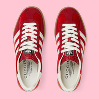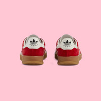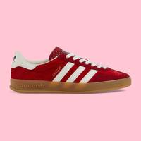 Part of the adidas x Gucci collection, this sneaker features a Gucci Trefoil print. adidas and Gucci venture into a collection, where the Web juxtaposes with the three white stripes, and the GG monogram combines with the trefoil. Pulling inspiration from the Creative Director’s memories of the '80s and '90s, emblematic House’s motifs mix with those of the historic sportswear brand adidas resulting in a series of hybrid looks. - Red velvet with details in Demetra—crafted from animal-free raw materials that are primarily from sustainable, renewable, and bio-based sources with yellow and white rubber details - Women's - Red suede trim - adidas x Gucci - Gucci Trefoil label - Gucci Trefoil print - White three stripes insert - 'Gazelle' embroidery - Gucci Trefoil embossed - Rubber sole - Lace-up closure - Made in Italy