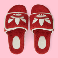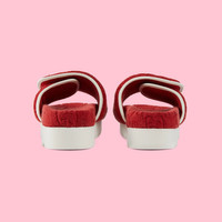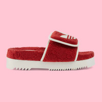 Part of the adidas x Gucci collection, this platform sandal features a Trefoil leather patch. adidas and Gucci venture into a collection, where the Web juxtaposes with the three white stripes, and the GG monogram combines with the trefoil. Pulling inspiration from the Creative Director’s memories of the '80s and '90s, emblematic House’s motifs mix with those of the historic sportswear brand adidas resulting in a series of hybrid looks. - Red GG cotton sponge - Women's - White Demetra trim—crafted from animal-free raw materials that are primarily from sustainable, renewable, and bio-based sources with yellow and white rubber details - adidas x Gucci - White Trefoil leather patch - Rubber sole - Adjustable velcro strap - Low heel - Made in Italy