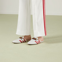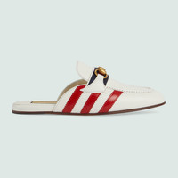 A second chapter in the adidas and Gucci collection, where the Web continues to juxtapose with the three white stripes and the GG monogram combines with the Trefoil. Pulling inspiration from the Creative Director’s memories of the '80s and '90s, emblematic House’s motifs mix with those of the historic sportswear brand adidas resulting in a series of hybrid looks. This leather slipper features the three stripes and Horsebit. - White leather - Women's - Gold-toned hardware - adidas x Gucci - Red trim - Horsebit with Web - Leather 3-Stripe - Leather sole - Flat - Made in Italy