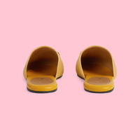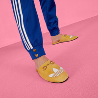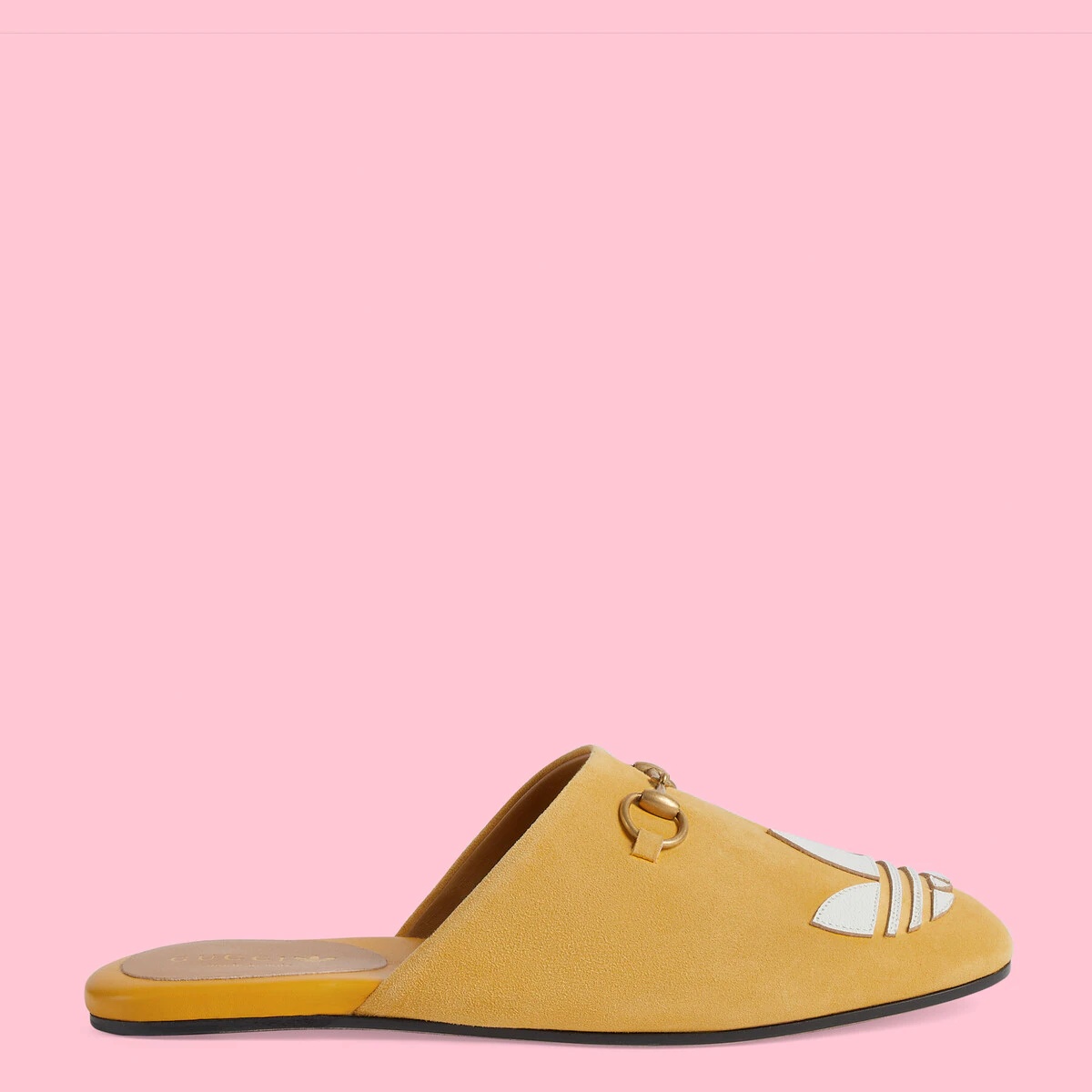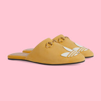 Part of the adidas x Gucci collection, this slipper features a Trefoil leather patch. adidas and Gucci venture into a collection, where the Web juxtaposes with the three white stripes, and the GG monogram combines with the trefoil. Pulling inspiration from the Creative Director’s memories of the '80s and '90s, emblematic House’s motifs mix with those of the historic sportswear brand adidas resulting in a series of hybrid looks. - Yellow suede - Women's - Antique gold-toned hardware - adidas x Gucci - White Trefoil leather patch - Horsebit detail - Leather sole - Flat - Made in Italy