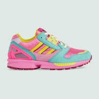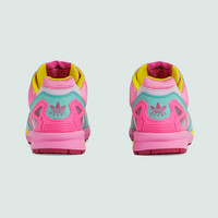 A second chapter in the adidas and Gucci collection, where the Web continues to juxtapose with the three white stripes and the GG monogram combines with the Trefoil. Pulling inspiration from the Creative Director’s memories of the '80s and '90s, emblematic House’s motifs mix with those of the historic sportswear brand adidas resulting in a series of hybrid looks. The Torsion model appears in a colorful GG canvas. - Pink and aquamarine leather and suede - Women's - adidas x Gucci - Gucci Trefoil Torsion label - Gucci Trefoil embroidery - Rubber sole - Lace-up - Low heel - Made in Italy