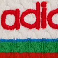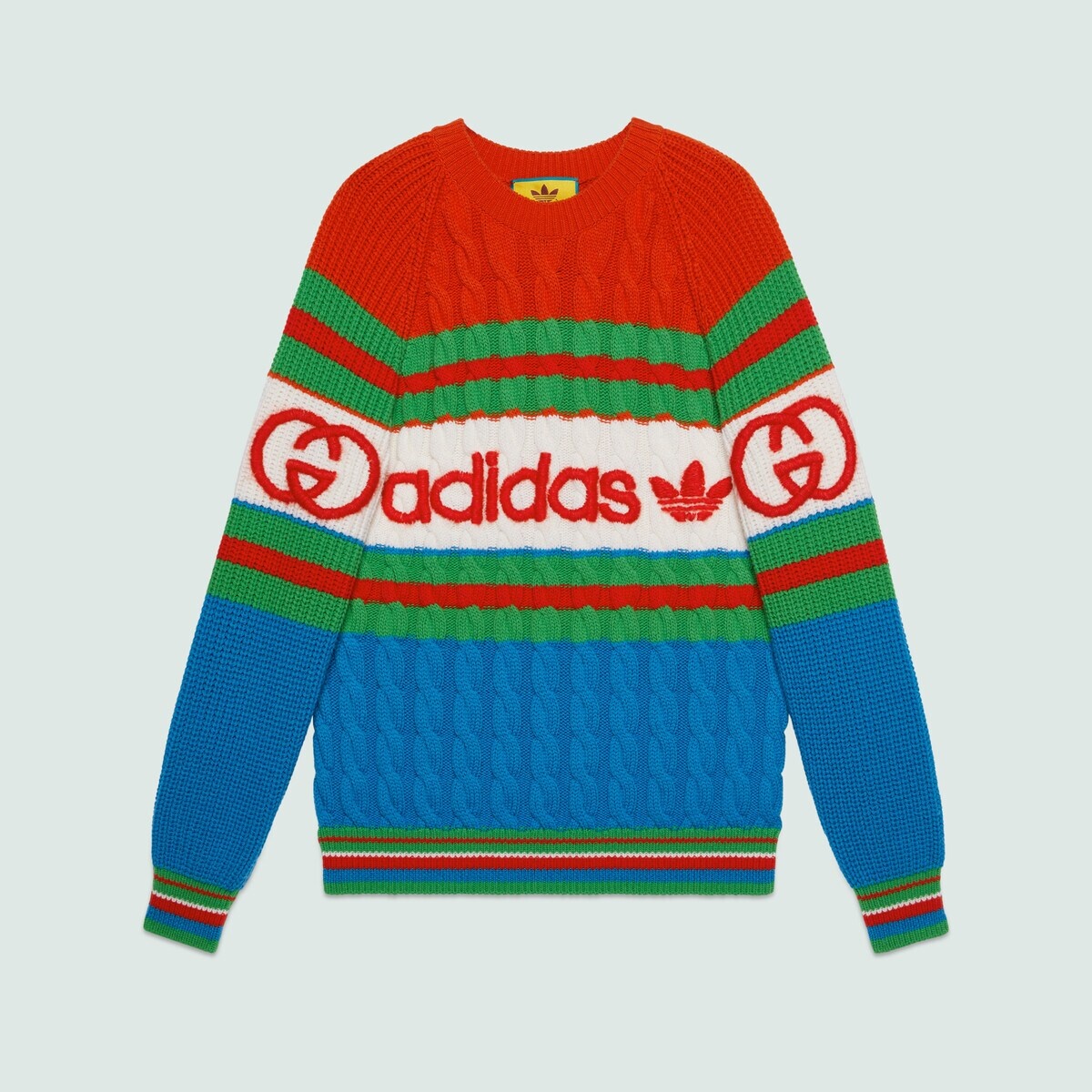A second chapter in the adidas and Gucci collection, where the Web continues to juxtapose with the three white stripes and the GG monogram combines with the Trefoil. Pulling inspiration from the Creative Director’s memories of the '80s and '90s, emblematic House’s motifs mix with those of the historic sportswear brand adidas resulting in a series of hybrid looks. This cable stitch wool sweater in blue and orange features a Gucci adidas Trefoil embroidery and Web detail. - Blue and orange cable stitch wool - Gucci adidas Trefoil embroidery - adidas x Gucci - Green and red Web - Crewneck - Length: 27.2" based on a size small - The product shown in this image is a size small