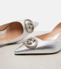 Made for starry evenings, the Alicia pumps from Gucci are crafted from silver-toned metallic leather. This eye-catching pair is finished with crystal-embellished Interlocking G hardware and is set on slim 55mm heels. Product Details - Upper: leather - Lining: leather - Sole: leather insole and sole - Toe shape: pointed toe - Made in Italy - Includes: shoe box, dust bag - Designer color name: Argento - Item color: silver - Item number: P01124324 Size & Fit - Fits slightly large to size - we recommend trying a half size smaller - European sizes - 5,5cm-2" heel