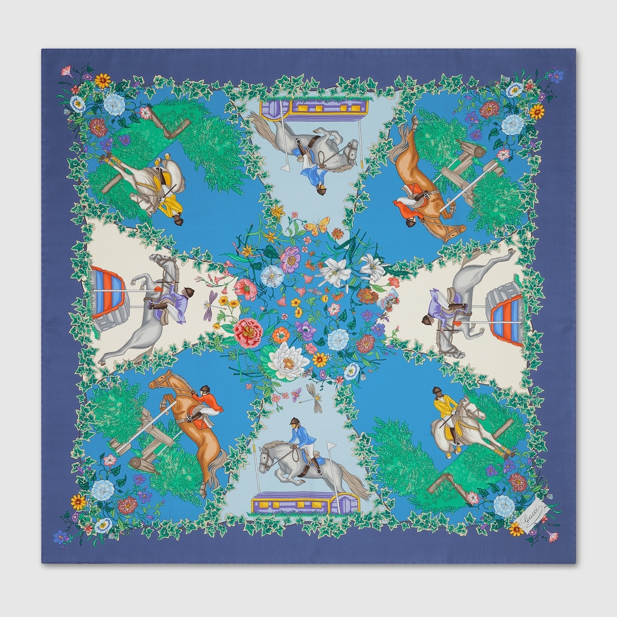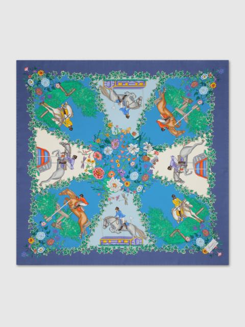 For the Cruise 2025 collection, signature symbols and codes of the House are reimagined in a modern way. This silk carre reveals a colorful floral equestrian print, offering a fresh take on Gucci's heritage. - Blue and multicolor silk - Allover floral equestrian print - 35.4"W x 35.4"L - Made in Italy - The dimensions of this item may vary slightly as the hem is hand-sewn
