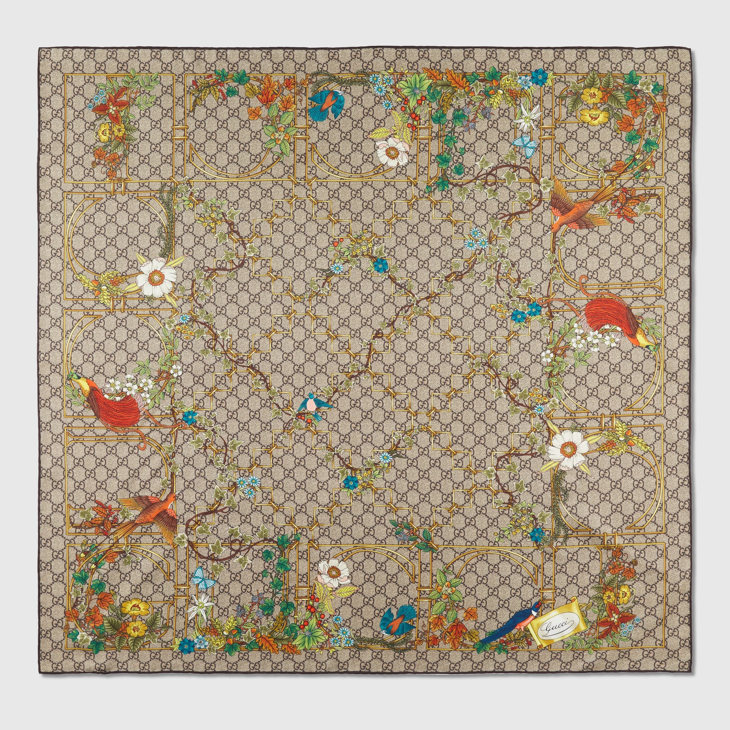 The House's heritage motifs shine through eye-catching new prints. Here, this carré features an animal and floral print, demonstrating Gucci's design inspirations from the natural world. - Multicolor Gucci animal and floral print brown silk twill - 35" x 35" - Made in Italy
