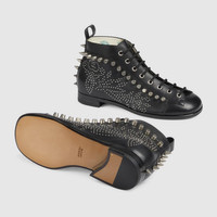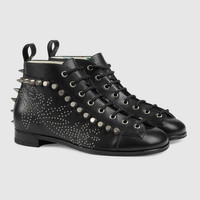Playing with details traditionally found on formal shoes, this pair of ankle boots is enriched by a brogue style motif. The perforated detail mixes a botanical motif with the House's emblematic monogram. A studded trim gives the style a contemporary edge. Pieces with versatile ways to wear and style embrace each person who is part of the House’s individual spirit. - Black leather - Studded trim - This product contains leather made through an innovative Scrap-less process that minimizes the production of finished leather scraps and decreases the consumption of new natural resources compared to traditional methods. We further reduce our environmental impact by tanning only the leather actually needed for production. - Foliage and Interlocking G brogue detail - Round toe shape - Lace-up closure - This item uses women's sizing - .6" heel height - Made in Italy
