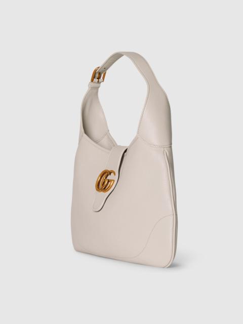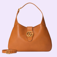 The Gucci Cosmogonie collection was presented against the backdrop of the historic Castel del Monte in Italy. The show brought together aesthetics from distant eras and geographies, and linked elements form the past with the present. This new crescent-shaped shoulder bag was shown on the runway and was inspired by the House’s archives, it is crafted in soft leather and features the Double G emblem—a code originally introduced in the 1970s. - Brown soft leather - Shiny gold-toned hardware - Interior: 1 zipper pocket - This style is sold with an additional strap which can be attached to the bag with a buckle closure - Handle: - Adjustable shoulder strap - Magnetic closure with Double G - Medium size: W39cm x H38cm x D2cm - Made in Italy