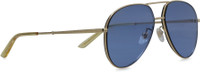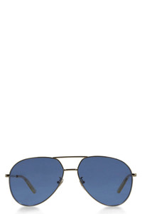 Gucci's take on the aviator sunglasses elevates the 1980s-inspired design with a gold-toned metal frame and blue lenses, adding a playful touch to the essential eyewear. The transparent yellow tip gives a modern take on the silhouette. - Shiny gold-toned metal frame with top bar - Shiny gold-toned engraved metal temples with contrasting tips - Solid blue lens - 100% UVA/UVB protection - GG0356S - Temple length: 5.7"; Lens height: 2.1", Nose bridge length: 0.6" - Frame height 2” - Frame width 5.5” - Made in Japan - The glasses will arrive in a velvet case, available in a range of six jewel-toned colors and paired with a coordinating satin lining. The case color will be individually selected for each pair of glasses and comes with a matching satin flannel pouch and ivory microfiber cloth.