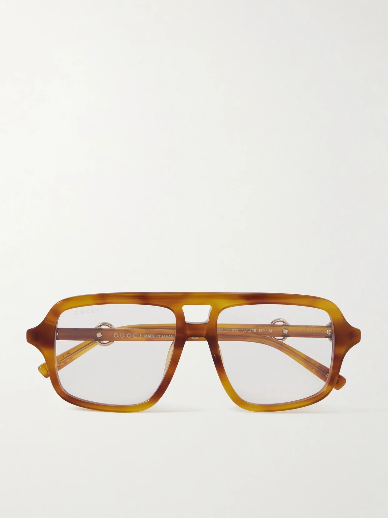 Gucci Eyewear's optical glasses nod to the bold lines of '70s design. Made from tortoiseshell acetate, they have thick aviator-style frames and clear lenses that can be swapped for prescription or UV-protective ones. The house's iconic horsebit hardware accents the arms.