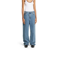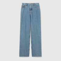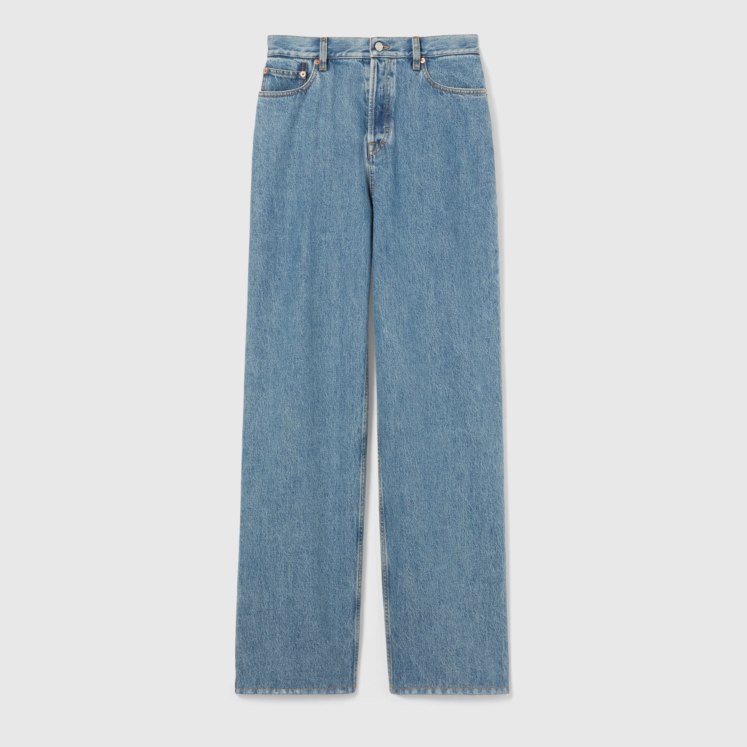 In the Spring Summer 2025 collection, the theme of casual grandeur pairs denim pants with key pieces. This baggy style is crafted from bleached washed denim. - Light blue washed cotton denim - Five pocket design - Gucci Rosso Ancora naplak label - Button closure - Baggy fit - Length: 47" based on a size 25 - Made in Italy - The model is 5'8" and is wearing size 25 (IT)