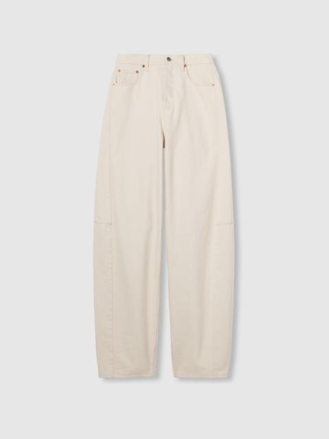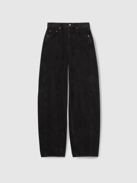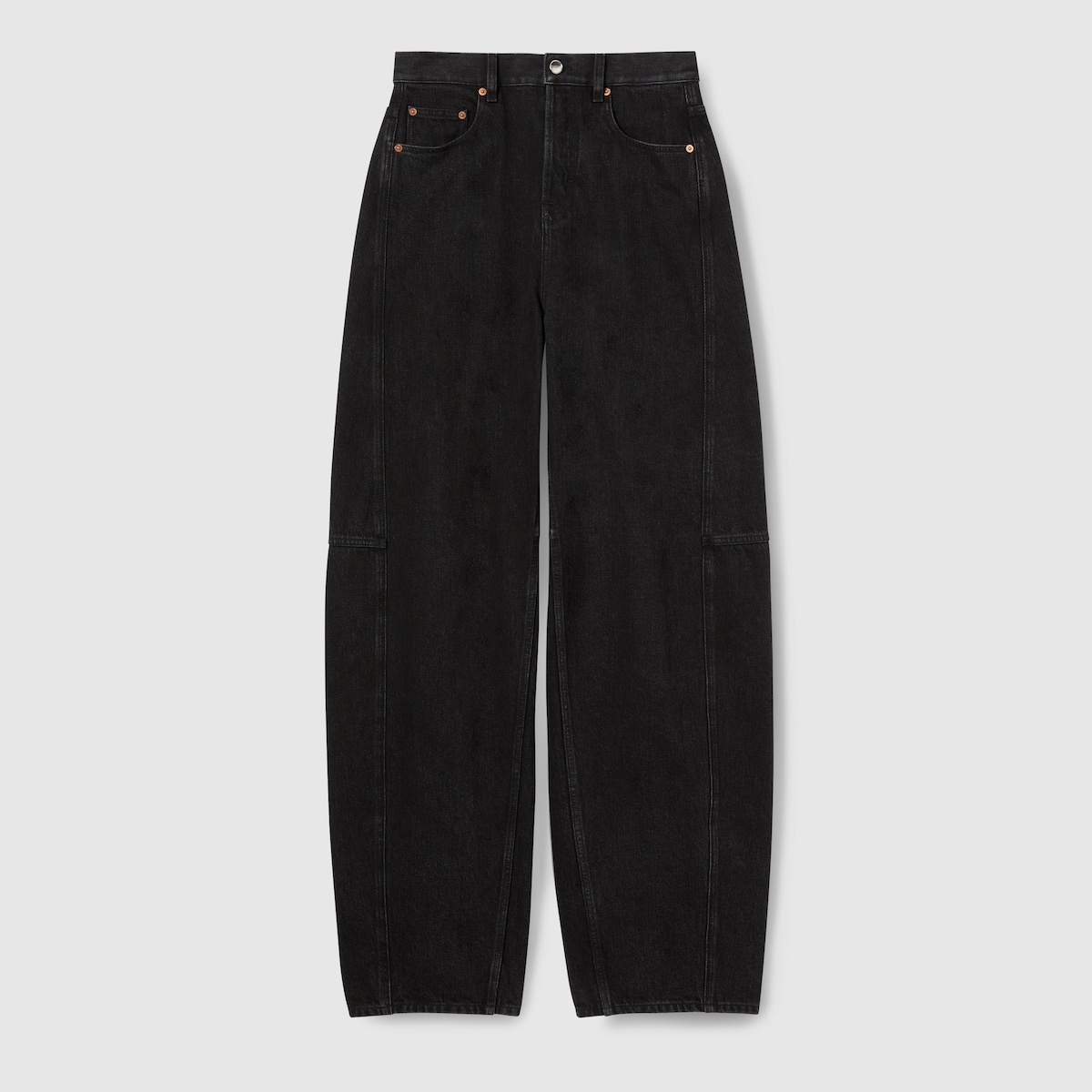 In the Spring Summer 2025 collection, the theme of casual grandeur pairs denim pants with key pieces. This balloon style with low waist is crafted from stonewashed denim. - Black cotton denim - Five pocket design - Gucci Rosso Ancora naplak label - Button closure - Low waist, balloon fit - Length: 48" based on a size 25 - Made in Italy - The model is 5'9" and is wearing size 25 (IT)