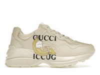 Bananya makes an appearance throughout the Ouverture collection celebrating the House's playful narrative that began six years ago. With dreams of becoming a fashionable chocolate-covered banana, the spirited cat is known for its charming pranks and friend-filled adventures. Here the cat animates this Rhyton sneaker, crafted primarily from Demetra. Created with the same processes used for tanning, the new material offers pliable and resilient performance with a supple finish. The eco-friendly material combines animal-free raw materials primarily from sustainable, renewable, and bio-based sources. - Ivory Demetra—crafted from animal-free raw materials that are primarily from sustainable, renewable, and bio-based sources - Women's - Bananya © BNF - Gucci logo and Bananya © BNF print - Rubber sole - Low heel - 1.8" height - Made in Italy