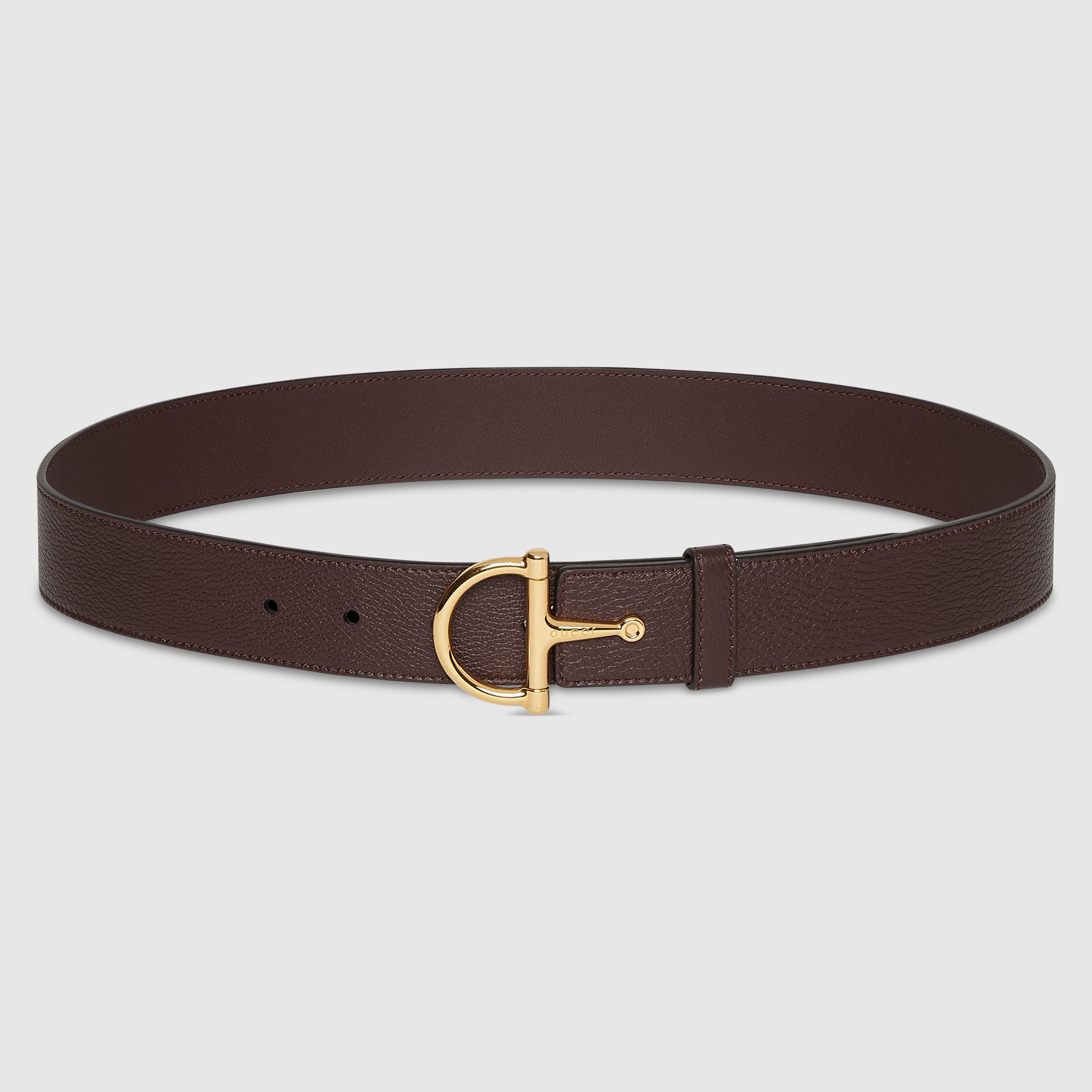 The maxi half Horsebit adorns a selection of women's belts, reinterpreting the House's equestrian-inspired hardware. This belt is presented in a grainy leather and defined by a half-Horsebit buckle. - Dark brown grainy leather - Light gold-toned hardware - Half-Horsebit buckle - 1.3" belt width - Made in Italy - Can be worn as a hip or waist belt. Sizing will differ based on where the belt is worn, please refer to the size guide to find your size.
