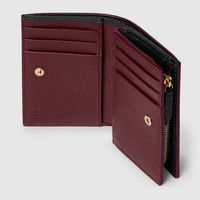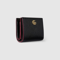 This GG Marmont bi-fold wallet is presented in black and Gucci Rosso Ancora leather with the Double G gold-toned hardware in petite dimensions. The accessory is completed by a zip pocket and a snap button closure. - Black and Gucci Rosso Ancora red leather - Gold-toned hardware - Gucci Rosso Ancora red taffeta lining - Double G - Inside: 1 zip pocket, 6 card slots, 1 bill compartment - Snap and zip closure - 4.5"W x 3"H x 1.1"D - Made in Italy
