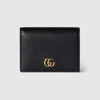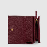 This GG Marmont small wallet reveals a contrasting color inside for an unexpected finish. The structured design features the signature Double G hardware in gold-toned finish. - Black and Gucci Rosso Ancora red leather - Gold-toned hardware - Gucci Rosso Ancora red taffeta lining - Double G - Five card slots, one open pocket - One bill compartment - Interior zipper pocket - Snap closure - Weight: 0.25lbs approximately - Open: 4.3" W x 6.9" H - Closed: 4.3" W x 3.3" H x 1.2" D - Made in Italy