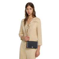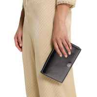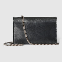 The GG Marmont collection introduces bi-color styles combining metallic leather on the outside and a contrast color on the inside. The crystal-embellished Double G detail adds a touch of sparkle on this wallet on chain. - Silver patent grainy leather - Bright blue leather interior - Light gold-toned hardware - Clear crystals - Bright blue taffeta lining - Double G - Inside: 6 card slots, 1 flat pocket, 1 zip pocket with gusset, 1 open compartment - Chain shoulder strap with 23.6" drop - Snap magnetic closure - 7.9"W x 4.9"H x 1.6"D - Weight: 2.2oz approximately - Made in Italy - Fits iPhone Pro