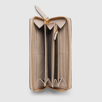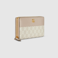 GG Marmont features colourful iterations, elevating signature silhouettes with new functions. This zip around wallet is presented in leather and GG Supreme, enriched with the Double G detail. - Beige and white GG Supreme and beige leather - Gold-toned hardware - Brown taffeta lining - Double G - 12 card slots and three bill compartments - Zip coin pocket - Zip around closure - Weight: 0.50lbs approximately - 7.5"W x 4.1"H x .8"D - Made in Italy