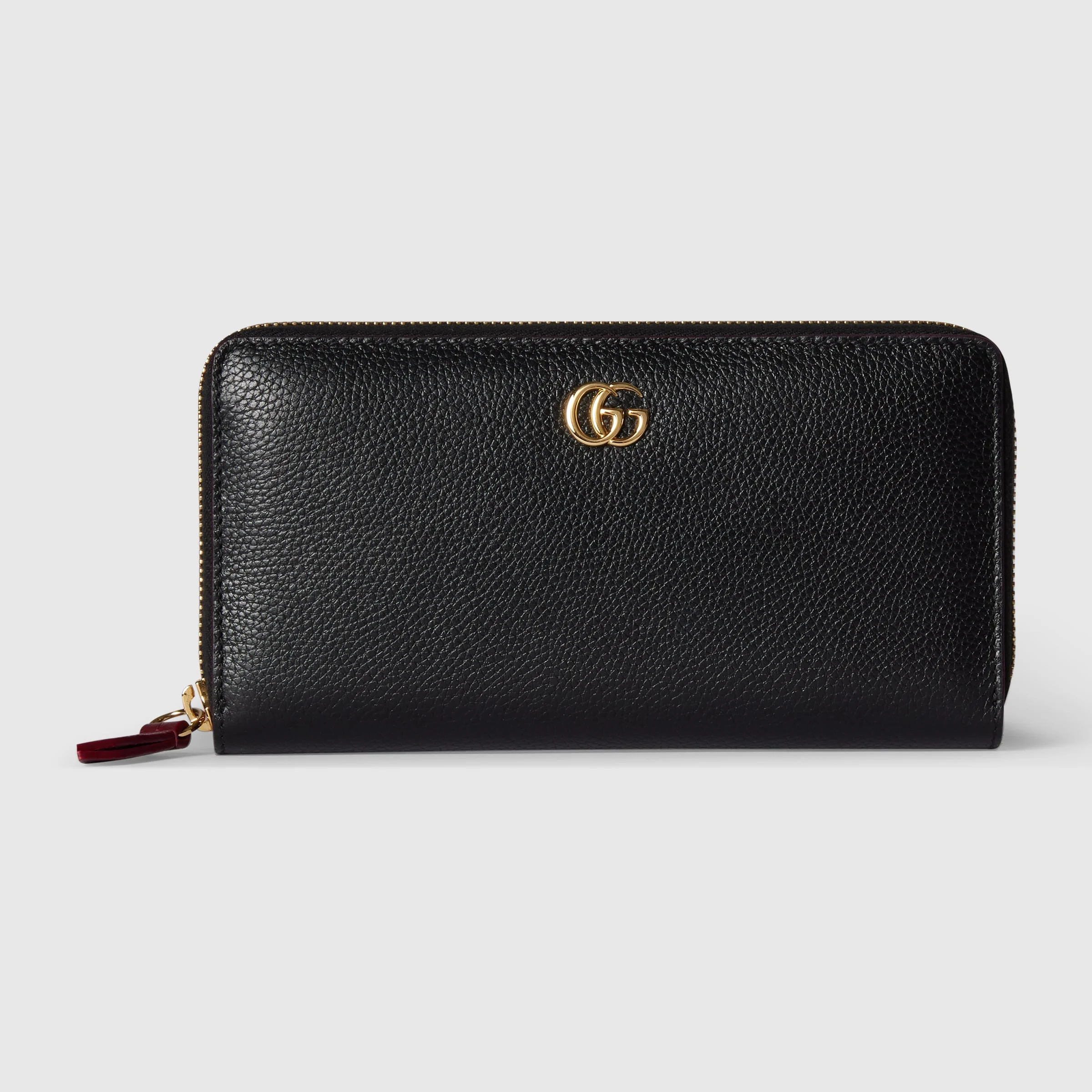 The GG Marmont small leathergoods collection presents contemporary silhouettes that blend different colors and materials in one style. This zip around wallet is crafted with leather in two different shades, complete with the archival Double G logo. - Black and Gucci Rosso Ancora red leather - Gold-toned hardware - Gucci Rosso Ancora red taffeta lining - Double G - 12 card slots and three bill compartments - Zip coin pocket - Zip around closure - Weight: 0.50lbs approximately - 7.5"W x 4.1"H x .8"D - Made in Italy