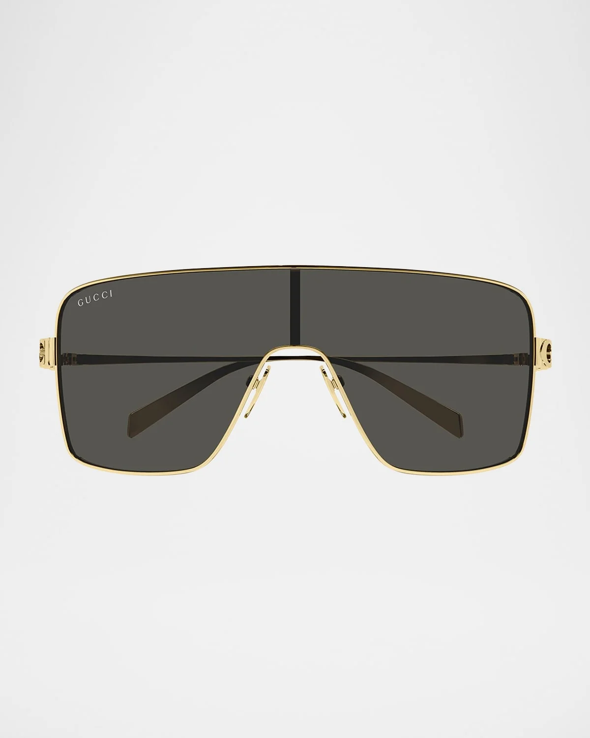 Featuring a logo insert detail at the hinges, the "Block Bending" metal sunglasses by Gucci blend a statement silhouette with a contemporary touch. Lens/bridge/temple (in mm): 991120 Shield frames Adjustable nose pads Thin, tapered arms Includes case and cleaning cloth 100% UVA/UVB protection Made in Japan