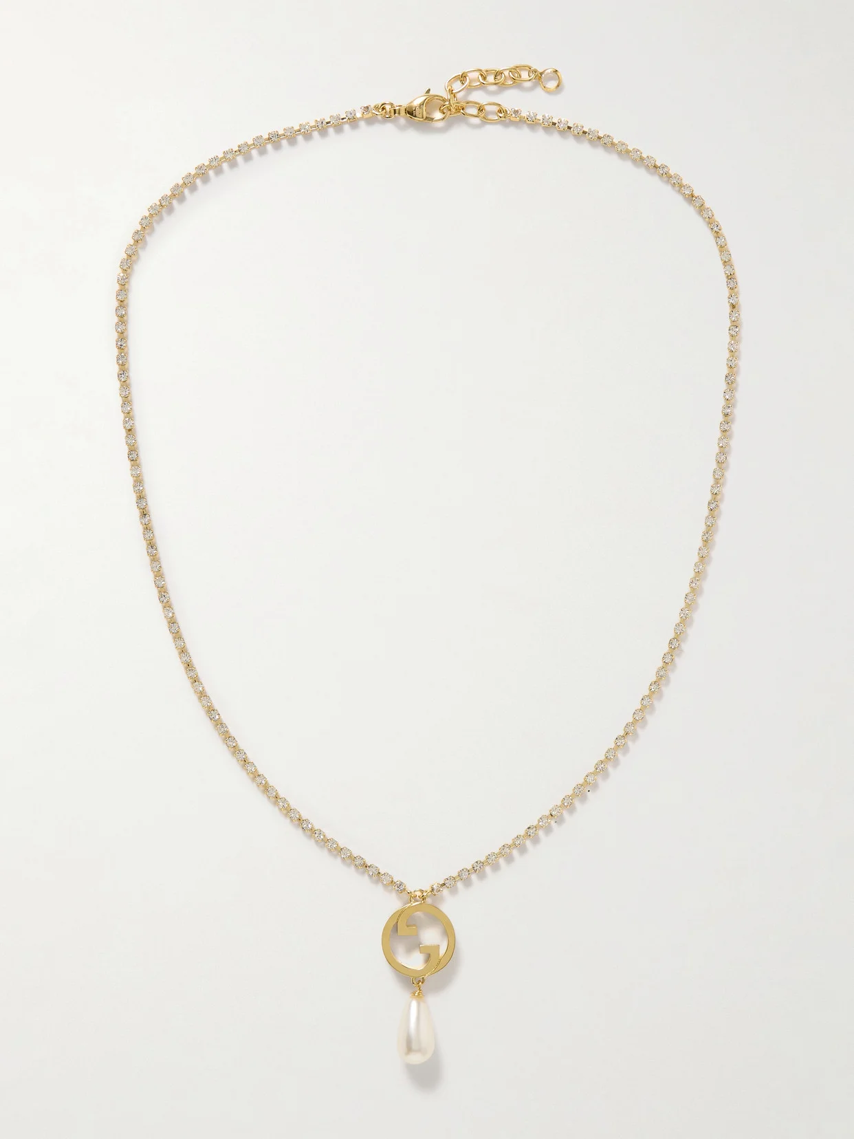 Gucci's gold-tone necklace puts its signature 'GG' motif on display so elegantly, framed by a strand of shimmering crystals and a single faux pearl drop. Adjust the slim chain to your preferred length.