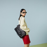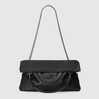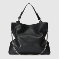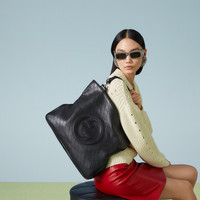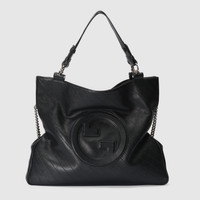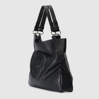 The Round Interlocking G that characterizes the Gucci Blondie line originates from the House archives. Signature pieces such as this Gucci Blondie tote bag with a top handle and chain shoulder strap reinterprets the emblem as a subtler leather patch detail. - Black leather - Cotton linen lining - Round Interlocking G leather patch - Inside: 3 main compartments and 1 zip pocket - Top handle with 7.9" drop - Chain shoulder strap with 16.5" drop - Medium size: 16"W x 13.6"H x 3.1"D - Made in Italy - The model is 5'9" tall - Weight: 2.6lbs approximately