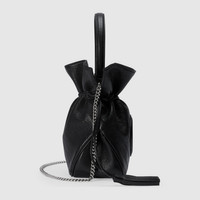 A bold motif of the House, the Gucci Blondie continues to exude subtle style, thanks to its tonal leather appearance. Formed from a rounded geometric version of the Interlocking G, the line exemplifies Gucci's contemporary design. The logo detail defines this mini bucket bag in black leather with tassel details. - Black leather - Taffeta lining - Round Interlocking G leather patch - Leather tassels - Top handle with 3.1" drop - Detachable chain shoulder strap with 21.6" drop - Drawstring closure - 5.9"W x 7.5"H x 3.1"D - Weight: 0.65lbs approximately - Made in Italy - Fits up to iPhone Pro Max/Plus, Airpods, small wallet, and lipstick