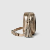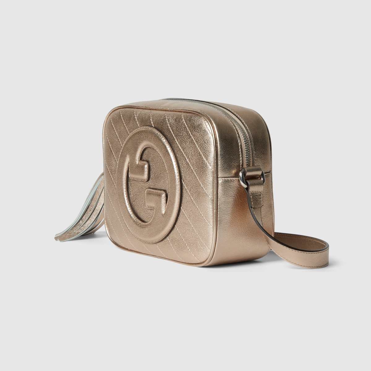 The Gucci Blondie continues to lend itself to numerous inspirations, including a metallic golden beige leather version which shines new light on the Round Interlocking G emblem. Here the lustrous material defines this small shoulder bag. - Metallic golden beige metallic - Silver-toned hardware - Brown cotton linen lining - Round Interlocking G leather patch - Side tassel detail - Adjustable shoulder strap with 21.4" drop - Zipper closure - Small: 8.3"W x 6.1"H x 3.1"D - Made in Italy - Fits up to: iPhone Pro Max/Plus, Airpods, small wallet, and lipstick