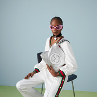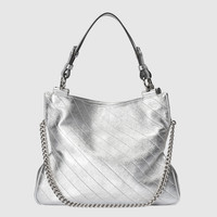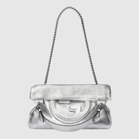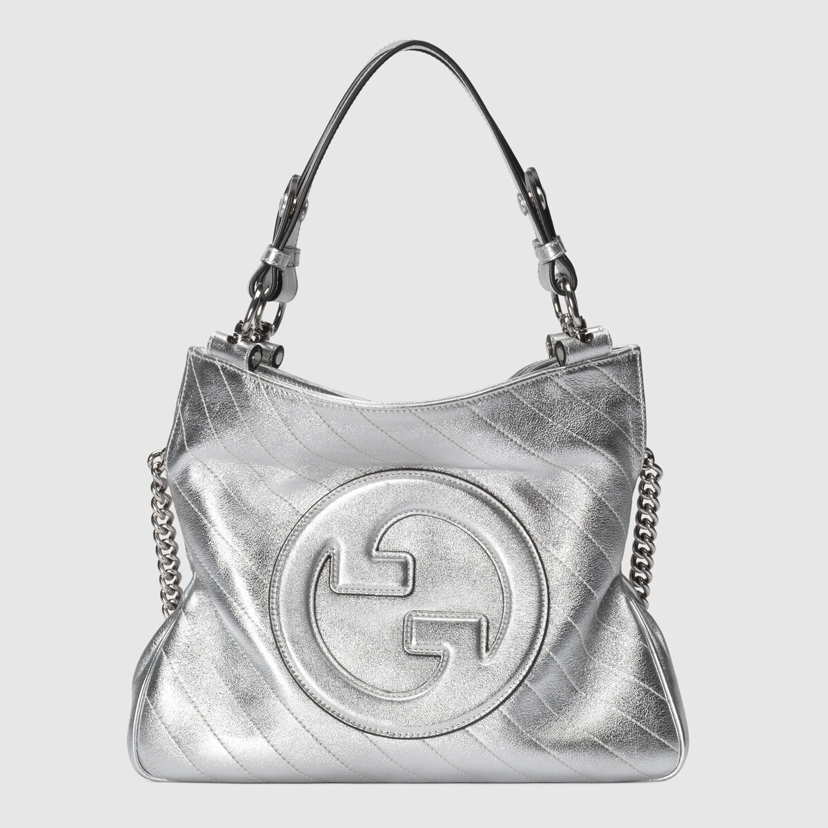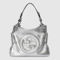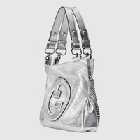 Vintage elements are paired with archival details as an ode to the glamour that permeates Gucci's latest collections. This Gucci Blondie tote bag pairs a top handle with a chain shoulder strap to infuse the accessory with a contemporary feel. The new silhouette appearing in a metallic silver leather, features a rounded iteration of Guccio Gucci's monogram as a front patch. - Silver lamé leather - Cotton linen lining - Round Interlocking G leather patch - Inside: 3 main compartments and 1 zip pocket - Top handle with 5.9" drop - Chain shoulder strap with 11.8" drop - Weight: 1.5lbs approximately - Small size: 11.8"W x 9.4"H x 2.4"D - Made in Italy - The model is 5'7" tall - Fits up to: iPhone Pro Max/Plus, Airpods, long wallet, and lipstick