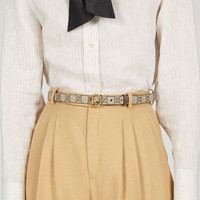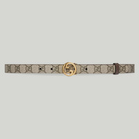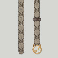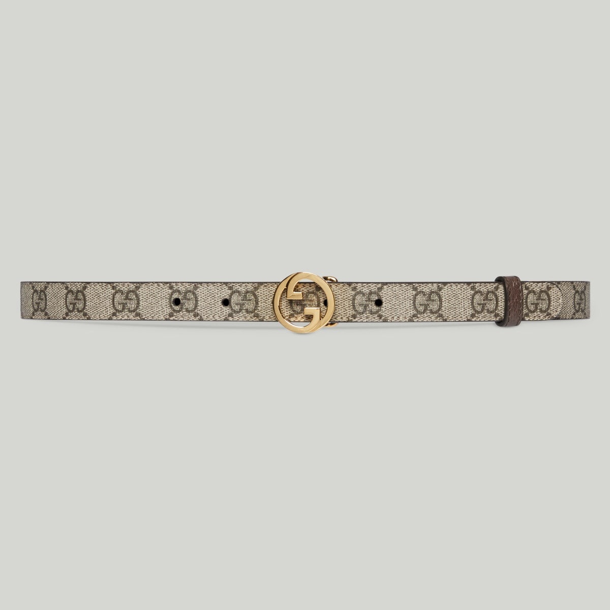 A heritage material from the archive, GG Supreme has been combined with contemporary as well as classic styles. This thin belt is presented in beige and ebony GG Supreme with a brown leather trim. A geometrically shaped Interlocking G logo defines the accessory. - Beige and ebony GG Supreme canvas - Brown leather trim - Gold-toned hardware - Round Interlocking G buckle - Width: .8" - Made in Italy - Can be worn as a waist belt. Sizing will differ based on where the belt is worn, please refer to the size guide to find your size.