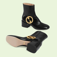 The Gucci Blondie first debuted along the star-studded Hollywood Boulevard in Los Angeles during Gucci Love Parade. The new line mirrors the mood found throughout the latest collection, bringing eras together by combining a retro aesthetic with a contemporary character. Taken straight from the '70s archives, the Founder's monogram defines this pair of black leather ankle boots. - Black leather - Women's - Gold-toned hardware - Round Interlocking G detail - Leather sole - Zip closure - Mid-heel - Made in Italy