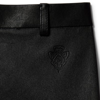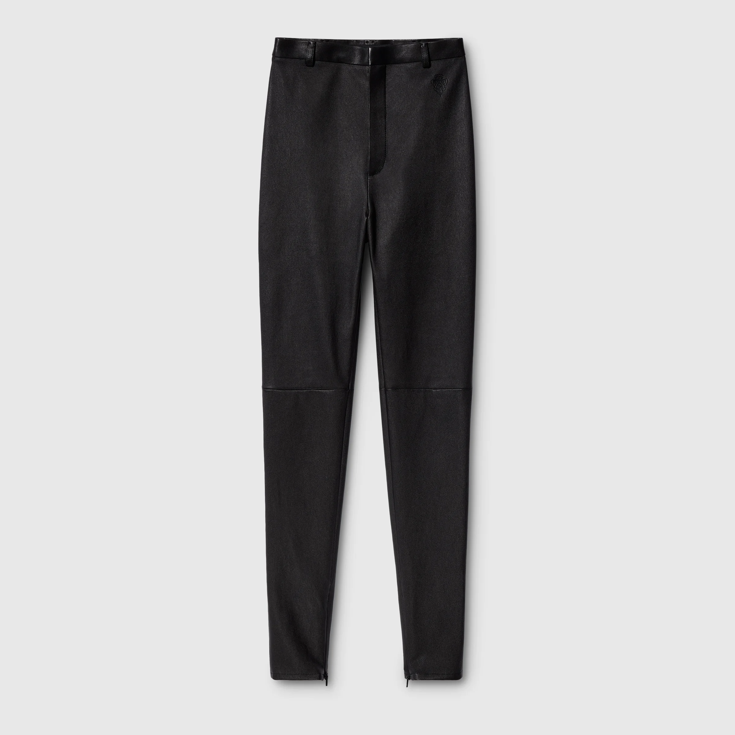 Introducing Spring Summer 2026. This style is part of the La Famiglia collection, which reinterprets the House’s codes through singular personalities and distinctive aesthetic attitudes. Crafted from bonded leather with stretch cotton, these leggings are enriched with an embossed Gucci crest detail. - Black bonded leather with stretch cotton - Embossed Gucci crest detail - Unlined - Belt loops - Zip at the ankle - Engraved Gucci zip puller with aged effect - Length: 41.7", based on a size 38(IT) - Made in Italy - Genuine leather: Lambskin