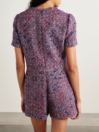 Sophisticated yet playful, Gucci's playsuit is made from wool-blend boucle-tweed with exaggerated knots. It's lined with crepe de chine, which gives it a smooth feel and it has a trio of buttons featuring the 'GG' logo along the shoulder. Size & Fit - Fits true to size, take your normal size - Designed for a slightly loose fit - Mid-weight, non-stretchy fabric - Model is 175cm/ 5'9" and is wearing an IT 40 Details & Care - Purple, tonal-red and white wool-blend boucle-tweed - Concealed hook and zip fastening at back - 86% wool, 11% polyamide, 3% polyester; lining: 75% acetate, 25% silk - Fully lined - Dry clean