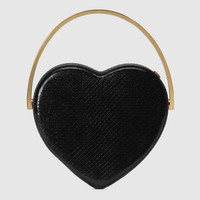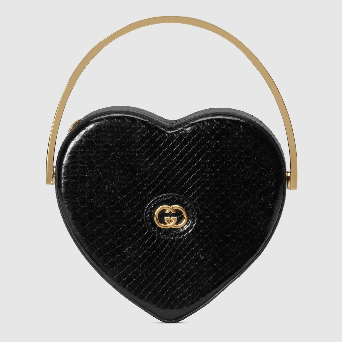 Inspired by timeless designs, the House presents contemporary takes on retro-inspired styles. With meticulous attention to detail and refined materials, accessories become wearable pieces of art for every day. The top handle over the heart-shaped design gives this python leather bag a whimsical twist. - Black python leather - Gold-toned hardware - Moire lining - Interlocking G - Top handle with 2.6" drop - Snap closure - Mini size: 6.1"W x 5.3"H x 2"D - Weight: 0.9lbs approximately - Made in Italy - The model is 5'7" tall