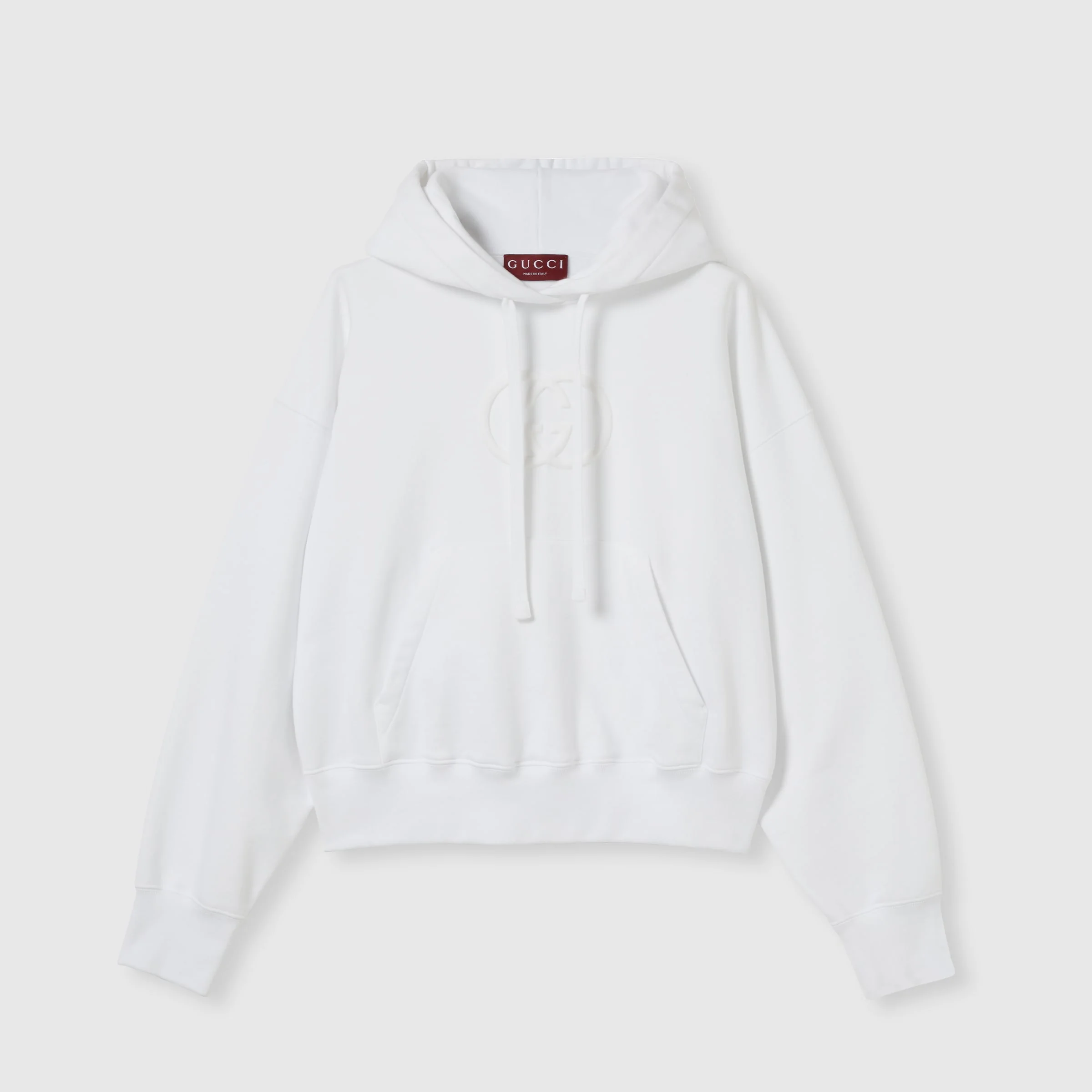In the Fall Winter 2025 collection, this sweatshirt is crafted from brushed cotton jersey. Designed with a boxy silhouette, the style features a front pocket, ribbed trims and an embossed Interlocking G logo across the chest. - White brushed cotton - Embossed Interlocking G logo - Fixed hood with drawstring - Front pocket - Ribbed cuffs and hem - Length: 20.7"; based on a size S - Made in Italy