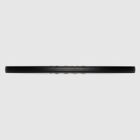 A selection of thin belts enriched the ready-to-wear looks from the Pre-Fall 2023 collection. The women's accessories feature various combinations of materials alongside the Gucci logo. Crafted from soft black leather, this belt is decorated by a Gucci logo buckle in gold-tone. - Black leather - Gold-toned hardware - Gucci buckle - .6" width - Made in Italy - Can be worn as a waist belt. Sizing will differ based on where the belt is worn, please refer to the size guide to find your size.
