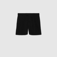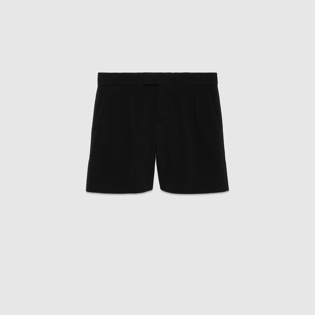 The Cruise 2024 collection features a wide range of pant suits in houndstooth, Prince of Wales, and classic menswear patterns. Worn separately or as an ensemble, blazers, pants, and skirts form an essential part of the transitional season wardrobe. This elegant pair of shorts is presented in a black wool jersey and enriched with a Gucci Web label. - Black wool jersey - Ribbon trim - Gucci Web label - Internal tape belt - Belt loops - Two front slash pockets - Two back besom pockets - Tab button closure - Length: 15.7" based on a size 40 (IT) - Leg opening: 27.9", based on a size 40 (IT) - Made in Italy - The product shown in this image is a size 40 (IT)