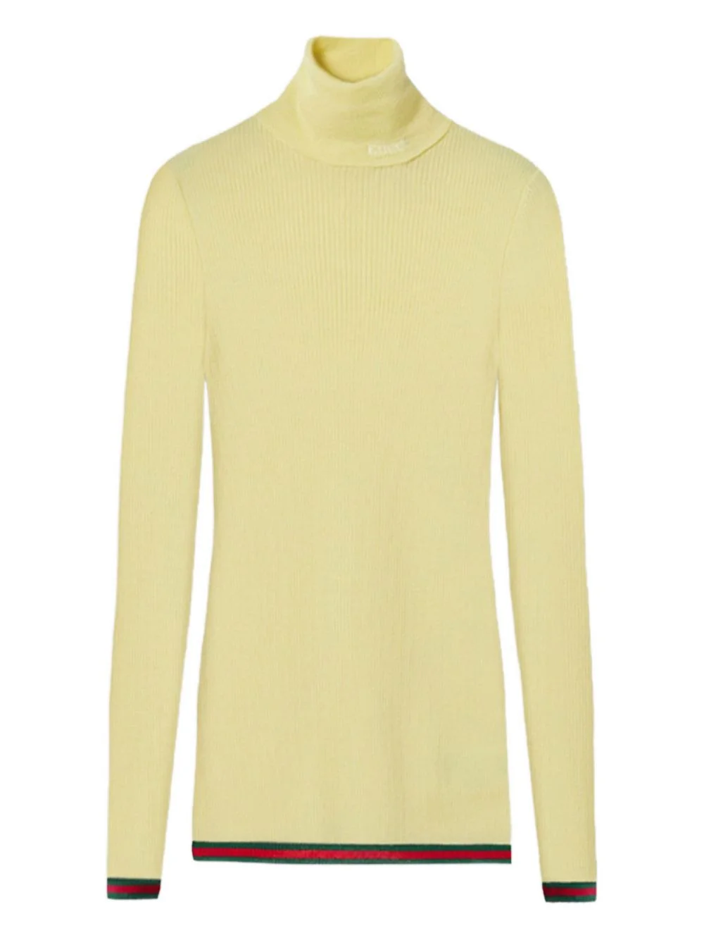 ribbed-knit turtleneck top Highlights - Yellow - Ribbed knit - Turtleneck - Long sleeves - Hem detail Made in Italy Composition Viscose 83%, Cashmere 70%, Silk 30%, Polyester 17% SIZE & FIT FittingInformation Designed for a close fit throughout Made with a midweight knit, this piece offers some stretch Washing instructions Read Manufacturer Guidelines