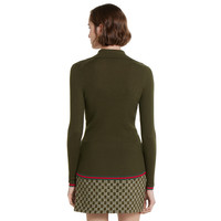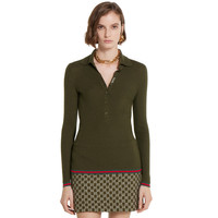 Gucci's House codes continue to evolve for Pre-Fall 2025 across relaxed knitwear pieces. Crafted from an extra fine cashmere and silk rib, this polo top reveals a Gucci embroidered detail on the front and reveals a green and red Web trim across the cuffs and hem. - Forest green extrafine cashmere and silk rib - Gucci embroidered detail on the placket - Polo collar - Long sleeves - Web trim - Button closure - Length: 25.2"; Shoulder: 11"; Half waist/chest: 12.6"; Sleeves length: 25.2" based on a size S - Made in Italy - Fabric: 70% Cashmere, 30% Silk - Details: 54% Cashmere, 26% Silk, 15% Viscose, 3% Polyester, 1% Elastane, 1% Polyamide